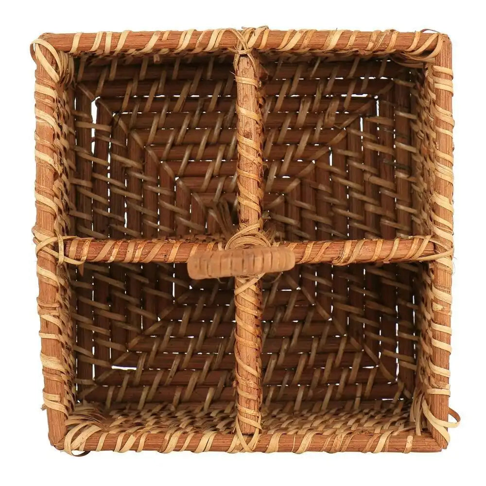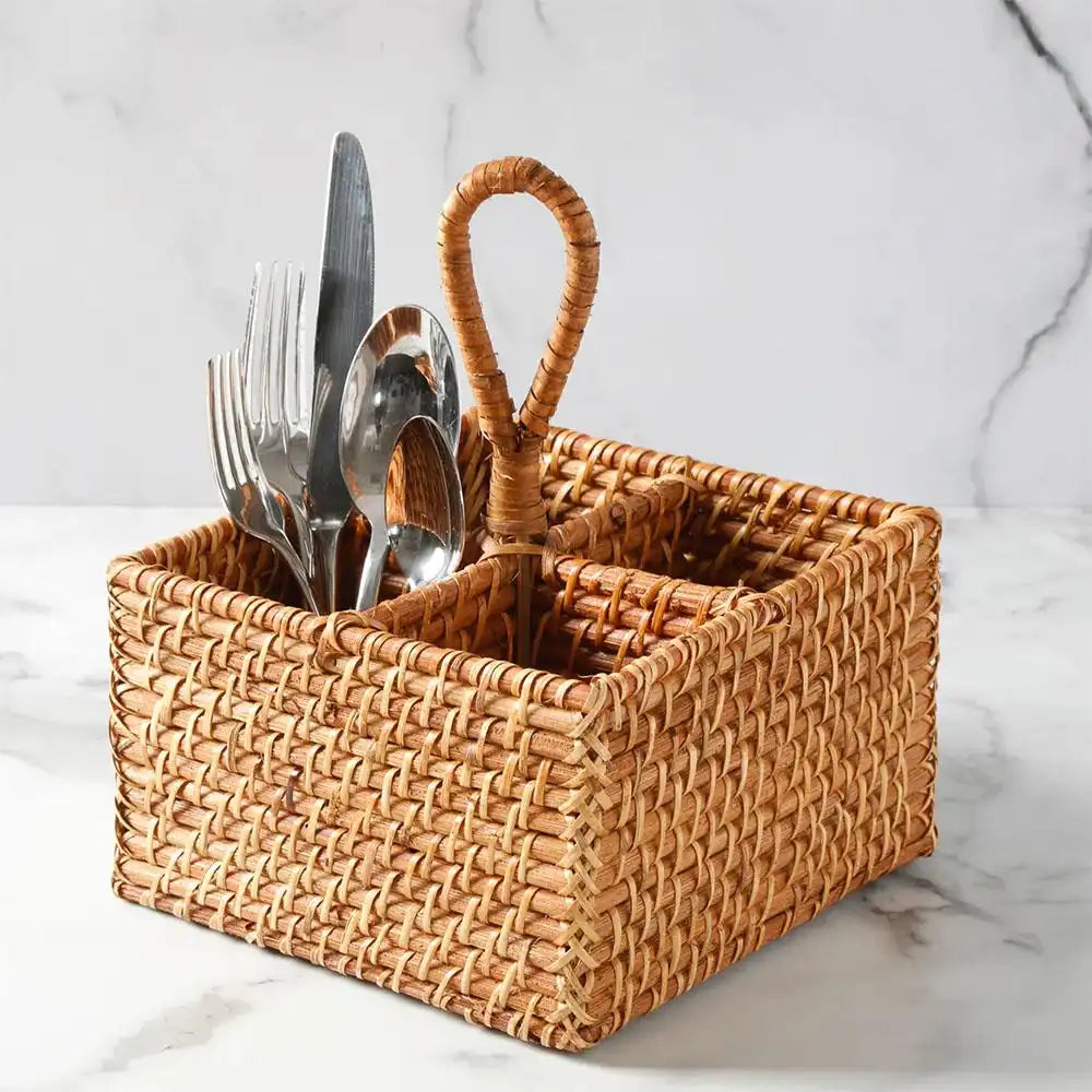 El Porta Cubiertos Martha Stewart Seawell de Mimbre combina practicidad y diseño sofisticado para transformar tu mesa. Con su estructura de ratán tejido a mano, este organizador es ideal para mantener tus cubiertos y servilletas perfectamente clasificados, ya sea en interiores o al aire libre.